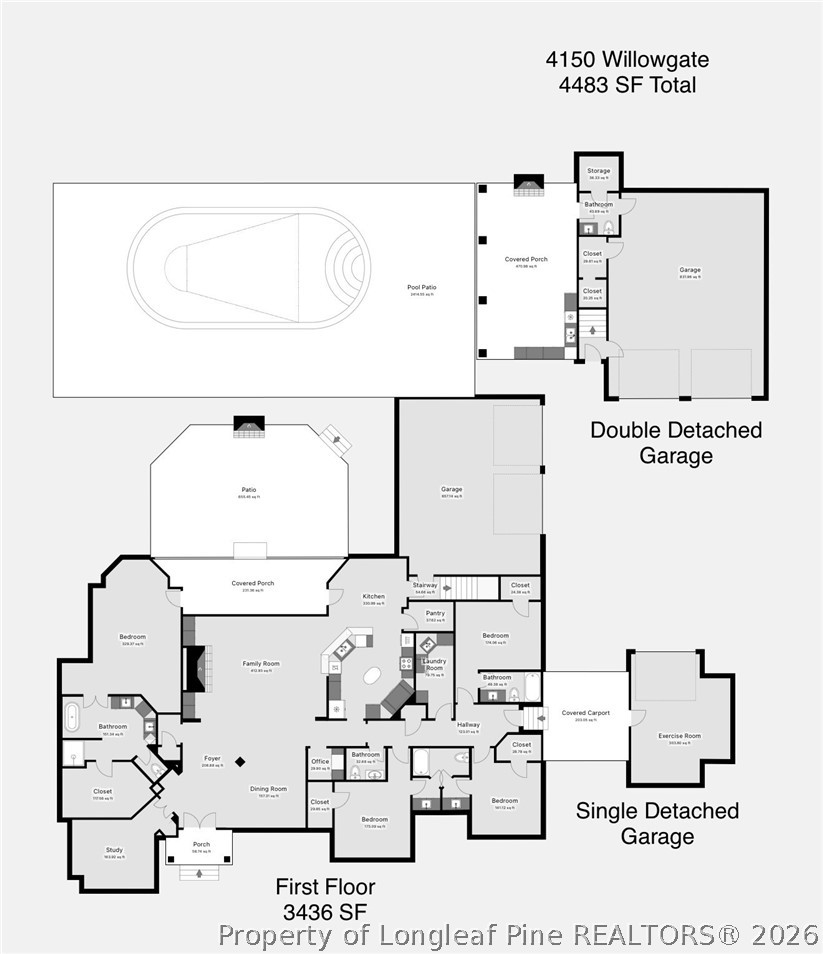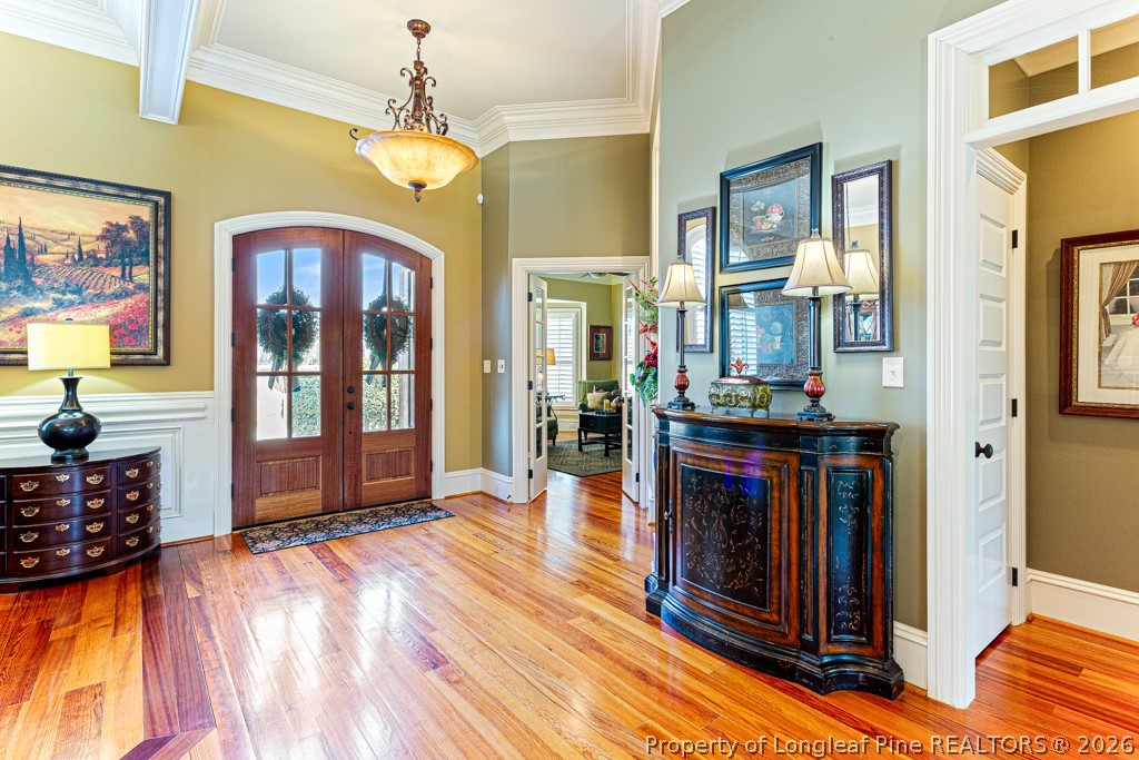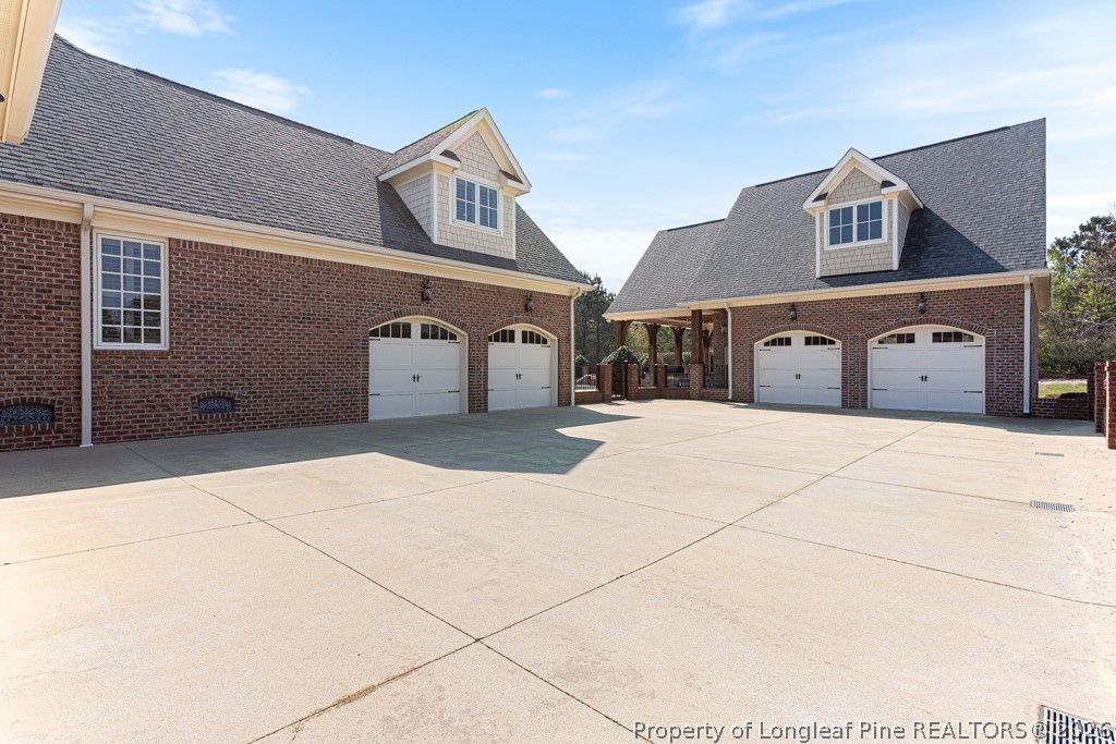 Welcome to an extraordinary custom brick estate located in the exclusive gated community of Willowgate, perfectly positioned on a 1.14-acre pond-front lot. This remarkable residence offers 6 bedrooms, 4 full baths, and 3 half baths, combining timeless craftsmanship with refined luxury throughout. From the moment you enter, you'll notice the exceptional detail--extra-thick moldings, extensive custom trim, and beautifully designed custom closets. Rich pine hardwood floors flow throughout the home, creating warmth and elegance at every turn. The gourmet kitchen is a true showpiece, featuring a premium range with hooded vent, a spacious island with breakfast bar, and an ideal layout for both everyday living and upscale entertaining. The main-level owner's suite is a private retreat, complete with an oversized walk-in closet and a stunning fully tiled spa-style shower. The main floor also includes three additional bedrooms and two full baths, offering comfort and convenience. Upstairs, a large bonus room with full bath provides flexible space for a media room, guest suite, or private retreat. Car enthusiasts and hobbyists will appreciate the expansive garage space, including a double attached garage, additional single-car garage, and a detached double garage featuring a private upstairs suite/bonus room with full bath and abundant storage. Step outside to your own private resort. The covered porch is designed for entertaining, featuring an outdoor kitchen with grill, generous seating areas, and seamless flow to the saltwater in-ground pool. The beautifully landscaped grounds and serene pond views create a peaceful and luxurious outdoor experience. Ideally located just minutes from I-95 and downtown Fayetteville, this exceptional property offers both privacy and convenience--truly a rare opportunity to own a one-of-a-kind property.